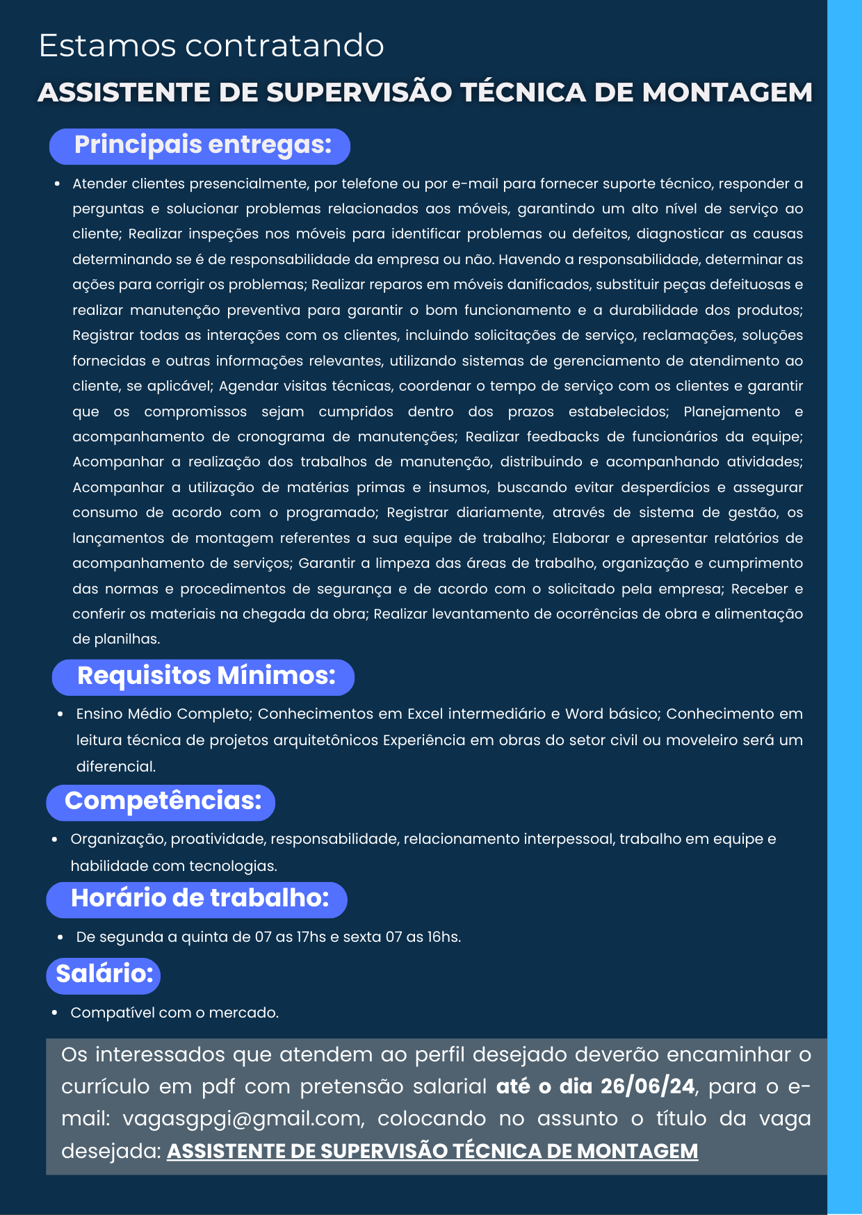 Atender clientes presencialmente, por telefone ou por e-mail para fornecer suporte técnico, responder a perguntas e solucionar problemas relacionados aos móveis, garantindo um alto nível de serviço ao cliente; Realizar inspeções nos móveis para identificar problemas ou defeitos, diagnosticar as causas determinando se é de responsabilidade da empresa ou não. Havendo a responsabilidade, determinar as ações para corrigir os problemas; Realizar reparos em móveis danificados, substituir peças defeituosas e realizar manutenção preventiva para garantir o bom funcionamento e a durabilidade dos produtos; Registrar todas as interações com os clientes, incluindo solicitações de serviço, reclamações, soluções fornecidas e outras informações relevantes, utilizando sistemas de gerenciamento de atendimento ao cliente, se aplicável; Agendar visitas técnicas, coordenar o tempo de serviço com os clientes e garantir que os compromissos sejam cumpridos dentro dos prazos estabelecidos; Planejamento e acompanhamento de cronograma de manutenções; Realizar feedbacks de funcionários da equipe; Acompanhar a realização dos trabalhos de manutenção, distribuindo e acompanhando atividades; Acompanhar a utilização de matérias primas e insumos, buscando evitar desperdícios e assegurar consumo de acordo com o programado; Registrar diariamente, através de sistema de gestão, os lançamentos de montagem referentes a sua equipe de trabalho; Elaborar e apresentar relatórios de acompanhamento de serviços; Garantir a limpeza das áreas de trabalho, organização e cumprimento das normas e procedimentos de segurança e de acordo com o solicitado pela empresa; Receber e conferir os materiais na chegada da obra; Realizar levantamento de ocorrências de obra e alimentação de planilhas.