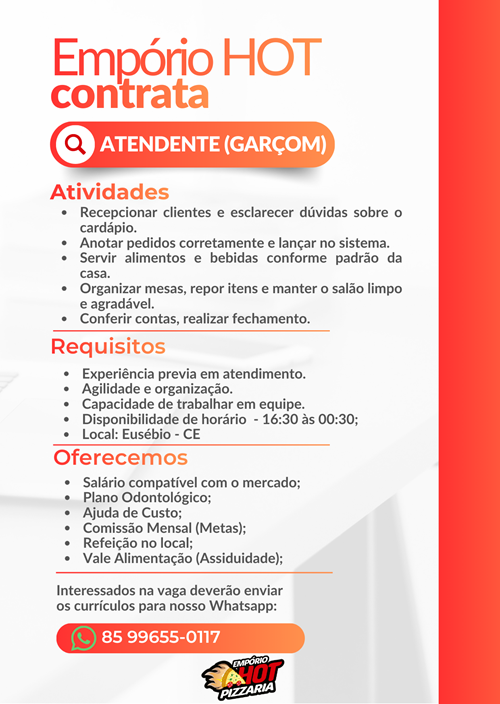 Mil detalhes, um objetivo. Na Emporio HOT Pizzaria, cada detalhe se constrói momentos marcantes. Esta é a nossa essência e nossa paixão. Construir momentos especiais é o que fazemos, um prato de cada vez, um cliente de cada vez. Isso porque a Emporio HOT é uma marca gerida por profissionais que são apaixonados por momentos especiais, por servir bem e encantar cada vez mais seus clientes. Com suas pizzas especiais e aperitivos diferenciados, a Emporio HOT caiu no gosto do cidadão eusebiense graças à qualidade.