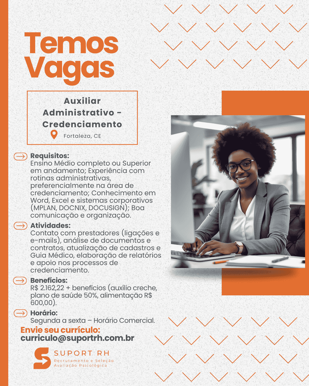 Ensino Médio completo ou Superior em andamento; Experiência com rotinas administrativas, preferencialmente na área de credenciamento; Conhecimento em Word e Excel; Desejável experiência com sistemas corporativos como MPLAN, DOCNIX e DOCUSIGN; Boa comunicação e capacidade de interação com áreas internas e externas.