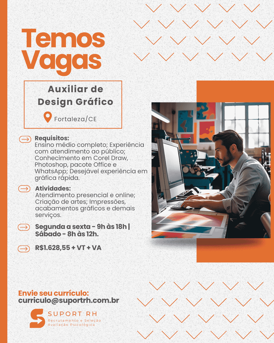 Ensino médio completo; Experiência em atendimento ao público, conhecimento em Corel Draw e Photoshop; Conhecimento em pacote Office, WhatsApp; Desejável ter experiência em gráfica rápida.