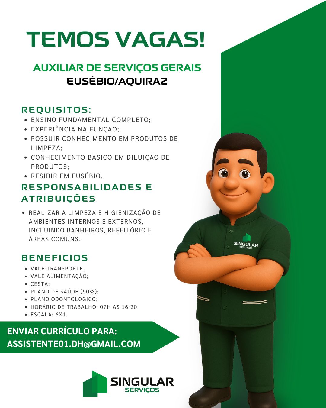 Estamos com processo seletivo aberto para a função de AUXILIAR DE SERVIÇOS GERAIS na região do Eusébio/ Aquiraz.