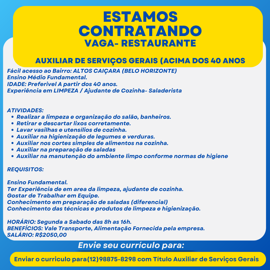 RESTAURANTE FAMILIAR, LOCALIZADO EM CAIÇARAS BELO HORIZONTE, ESTÁ EM BUSCA DE CANDIDATO PARA VAGA AUXILIAR DE SERVIÇOS GERAIS.
