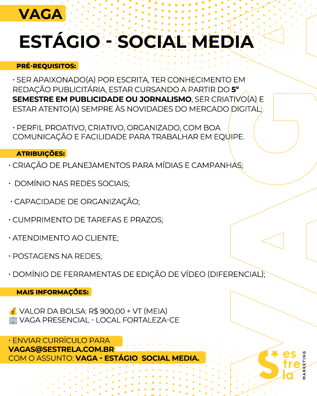 • Ser apaixonado(a) por escrita, ter conhecimento em redação publicitária, estar cursando a partir do 5º semestre em Publicidade ou Jornalismo, ser criativo(a) e estar atento(a) sempre às novidades do mercado digital;