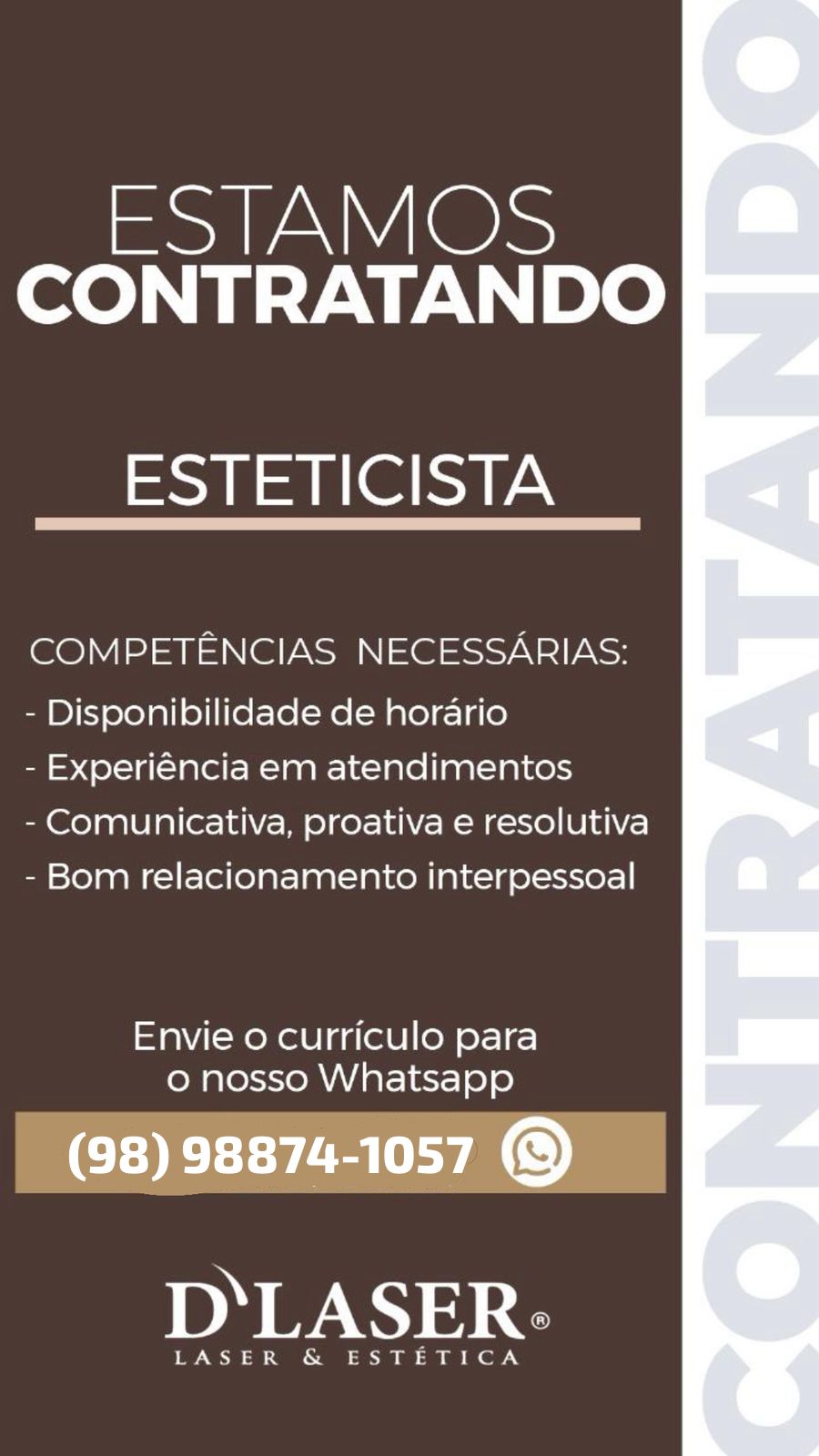 A D’LASER é referência em depilação a laser, oferecendo tecnologia avançada, segurança e resultados de alta qualidade. Nosso foco é proporcionar autoestima e bem-estar aos nossos clientes, com um atendimento humanizado e personalizado. Buscamos profissionais comprometidos, que gostem de cuidar de pessoas e queiram crescer junto com a empresa. Aqui, valorizamos o desenvolvimento, a dedicação e o trabalho em equipe, em um ambiente acolhedor e profissional.
