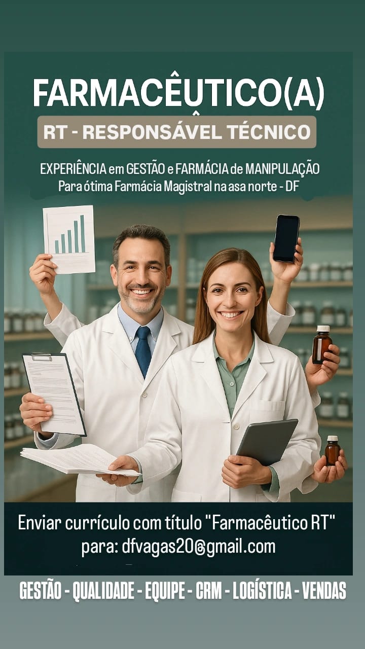 Trabalhará em FARMÁCIA de MANIPULAÇÃO na Asa Norte - DF com ótimo ambiente de trabalho e equipe