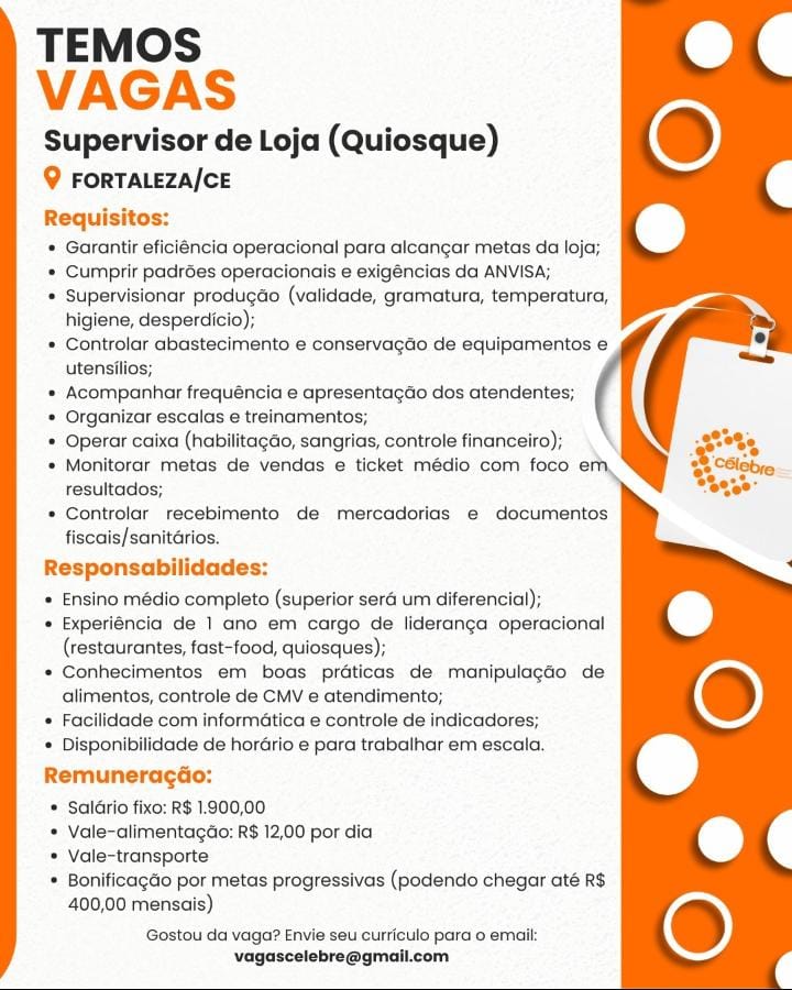 Estamos em busca de um profissional comprometido e proativo para liderar a operação de um quiosque alimentício. O Supervisor de Loja será responsável por garantir o bom funcionamento do ponto de venda, assegurando a qualidade dos produtos, excelência no atendimento ao cliente, controle de processos operacionais e motivação da equipe. Esse profissional será peça-chave para o alcance das metas de vendas e para o fortalecimento da imagem da marca perante o público.