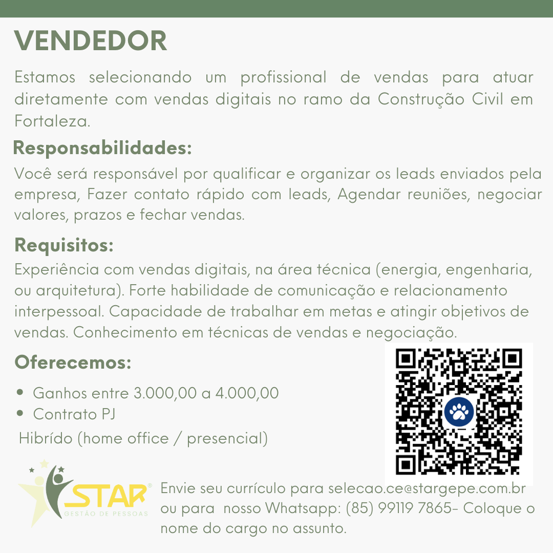 Estamos em busca de um profissional dinâmico e com experiência em vendas. Se você é uma pessoa comunicativa, com habilidades de negociação e um foco claro em resultados, esta é a oportunidade perfeita para você.