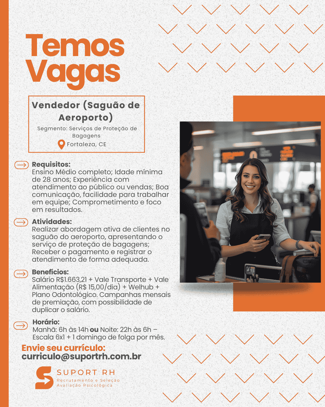 Realizar abordagem ativa de clientes no saguão do aeroporto, apresentando o serviço de proteção de bagagens; Receber o pagamento e registrar o atendimento de forma adequada.