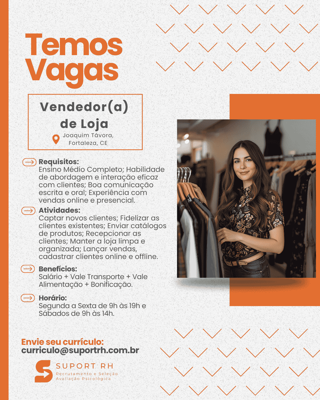 Ensino Médio Completo; Habilidade de abordagem e interação eficaz com clientes; Boa comunicação escrita e oral; Experiência com vendas online e presencial.